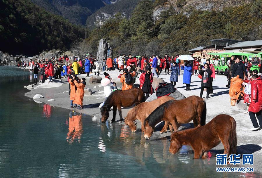 2月14日,游客在麗江玉龍雪山藍(lán)月谷游覽觀光。