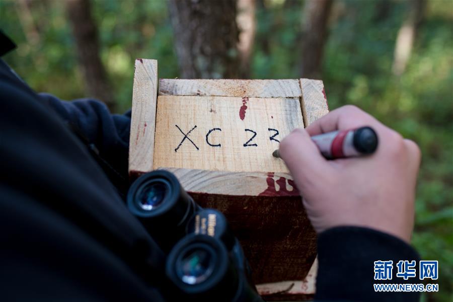 羅康在新做好的人工鳥巢底部寫下編號(hào)(12月12日攝)。 新華社記者 胡超 攝