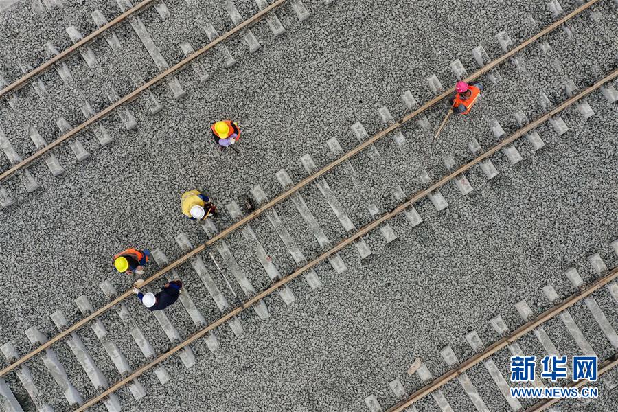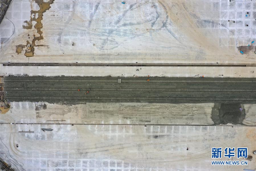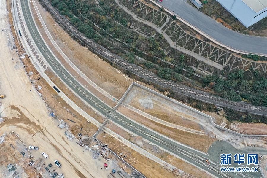 12月17日,中鐵八局建設(shè)者們在改貌鐵路口岸施工(無人機拍攝)。  新華社記者 劉續(xù) 攝