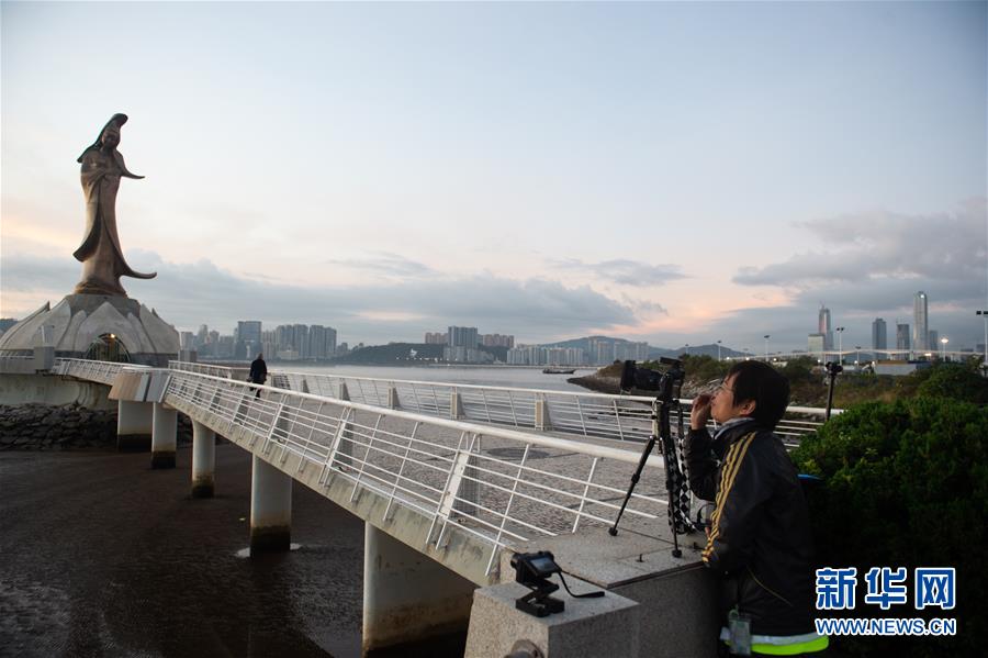 12月17日,一名女子在澳門拍攝日出。新華社記者杜宇攝