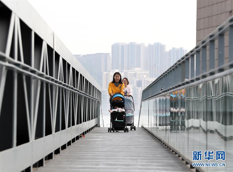 在澳門科學(xué)館附近,兩名女士推著嬰兒車過橋(12月17日拍攝)。新華社記者李鋼攝