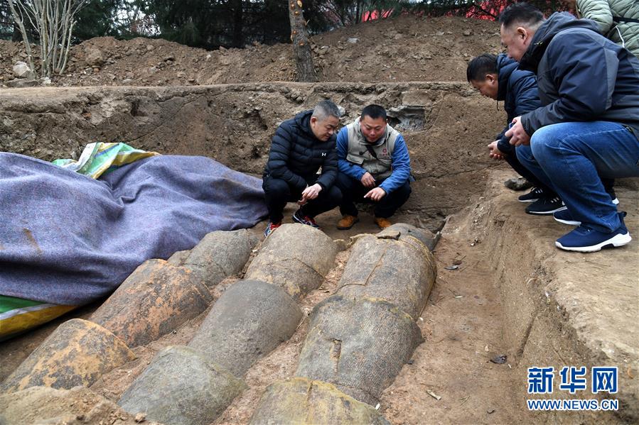 考古隊員(左二)在瑯琊臺遺址考古發(fā)掘現(xiàn)場介紹陶水管的構(gòu)造和結(jié)構(gòu)(12月21日攝)。新華社記者李紫恒攝