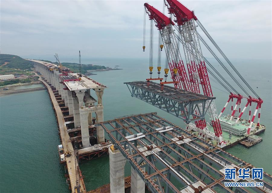 5月12日,“大橋海鷗號(hào)”起重船在吊裝一孔簡(jiǎn)支鋼桁梁(無人機(jī)拍攝)。新華社記者林善傳攝