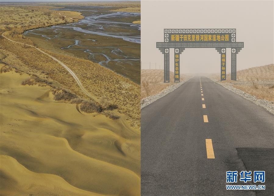 拼版照片:左圖為沿著克里雅河通向地處沙漠深處新疆于田縣達(dá)里雅布依鄉(xiāng)的路(3月19日無(wú)人機(jī)拍攝);右圖為從縣城通往達(dá)里雅布依小鎮(zhèn)易地扶貧安置點(diǎn)的柏油路(3月20日攝)。新華社記者胡虎虎攝