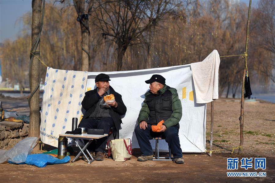 12月21日,72歲的石金城(左)在黃河中冬泳后在岸邊曬太陽,一邊聽著西北民歌吃東西一邊和朋友交談。新華社記者陶希夷攝