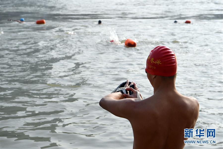 12月20日,冬泳愛好者孟猛在冬泳前測量水溫,當(dāng)日水溫僅為5攝氏度。新華社記者陶希夷攝