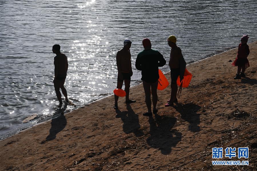 12月21日,冬泳愛好者準(zhǔn)備進(jìn)入黃河開始冬泳,一名身著冬裝的小女孩(右一)在一旁觀看。新華社記者陶希夷攝