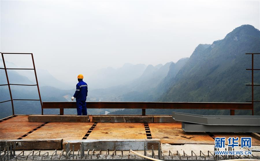 2019年1月7日,建設者在世界第一高混凝土橋塔上建設平塘特大橋。新華社記者歐東衢攝