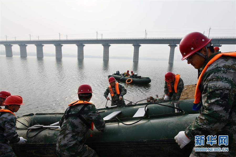 1月3日,中國鐵路濟(jì)南局鐵道戰(zhàn)備舟橋處工程人員準(zhǔn)備船只前往預(yù)定地點(diǎn)檢查橋墩。