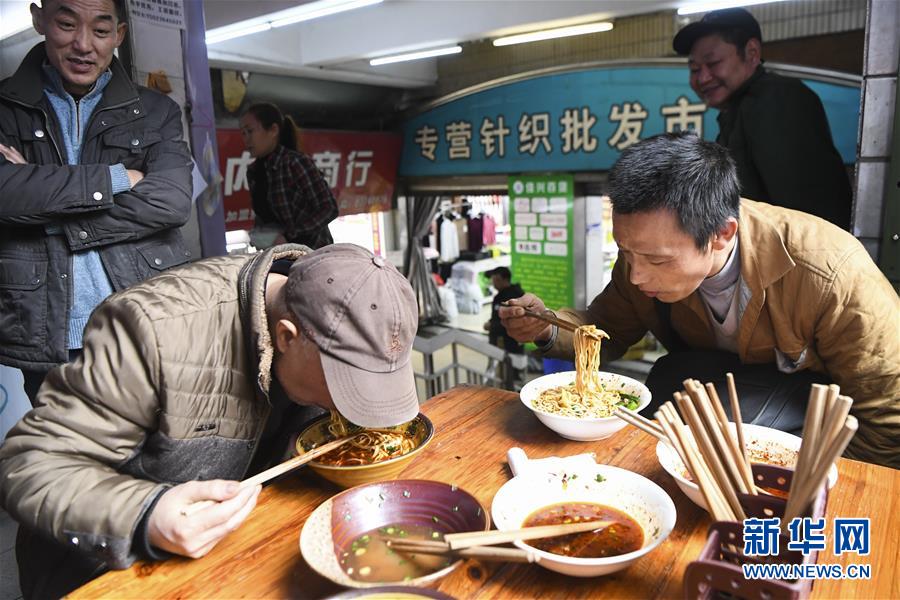 冉光輝(前右)在重慶朝天門大正商場(chǎng)附近吃小面,這是他的午餐(1月5日攝)。新華社記者王全超攝