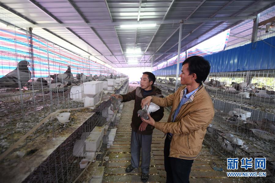 八好村駐村第一書記韋德王(右)在扶貧養(yǎng)殖場了解乳鴿的生長情況(2019年12月16日攝)。新華社記者黃孝邦攝