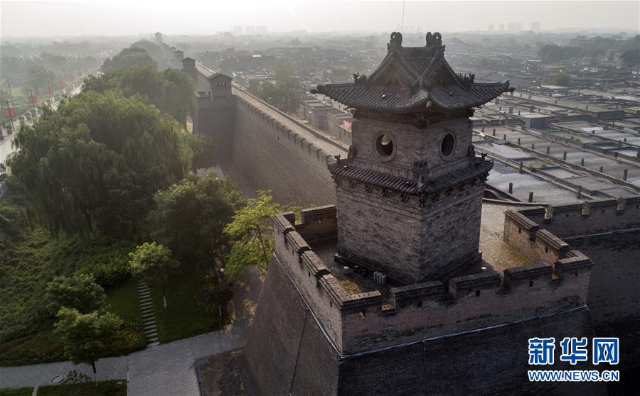 這是7月20日無(wú)人機(jī)拍攝的平遙城墻上的角樓。