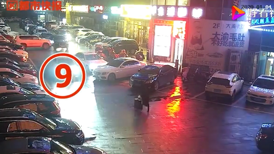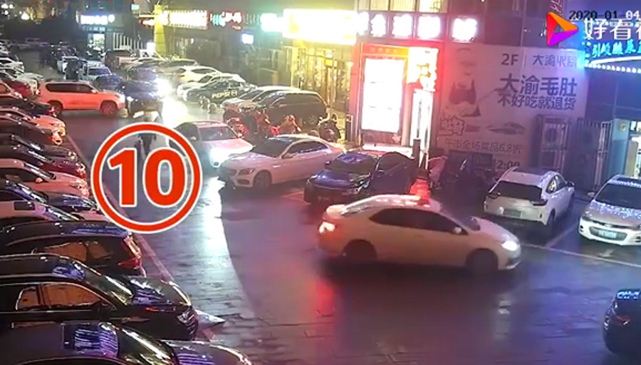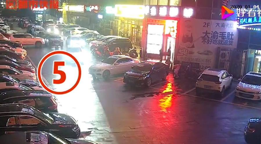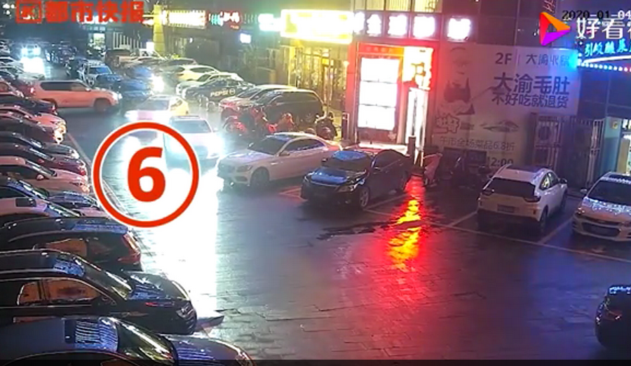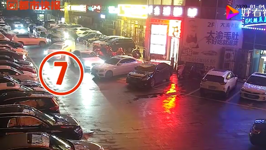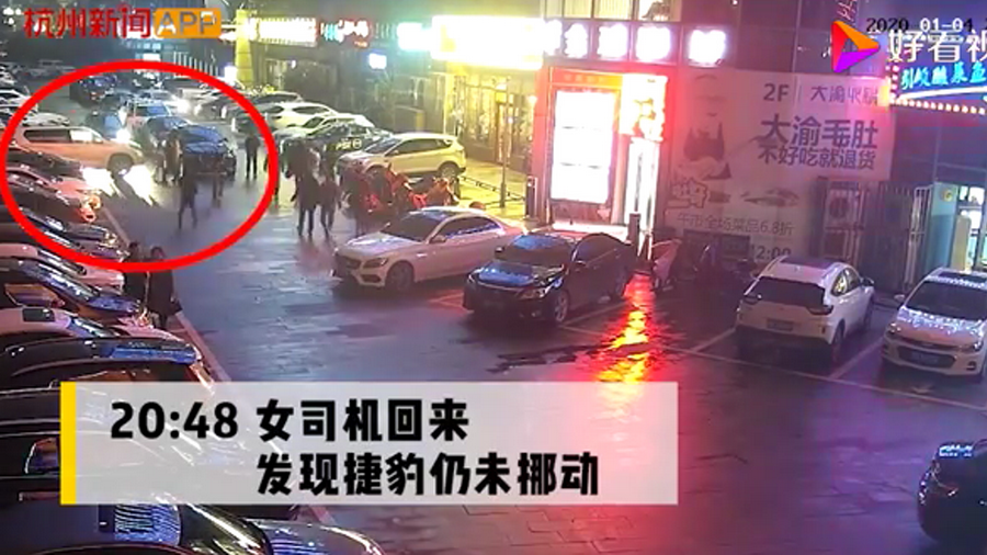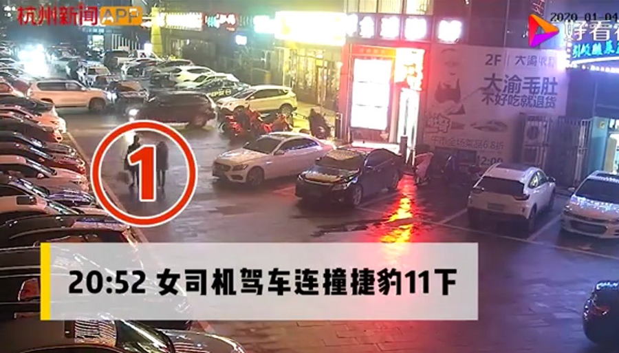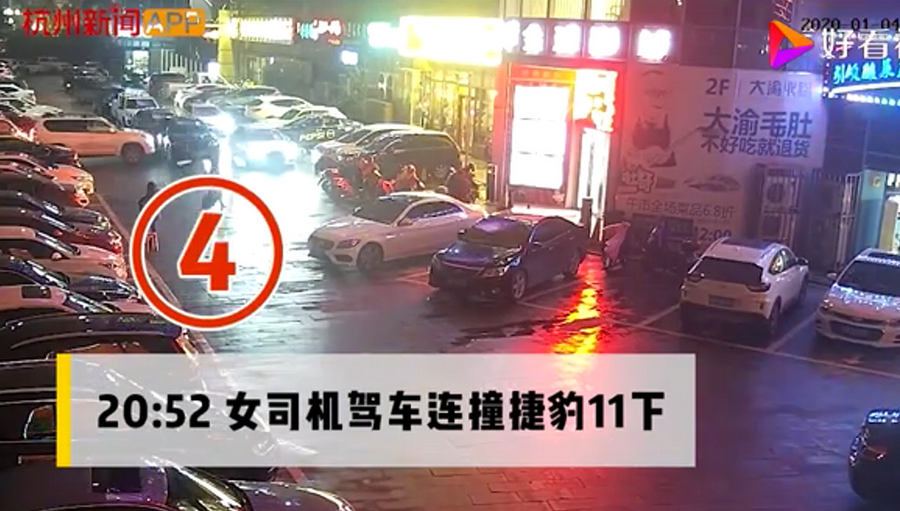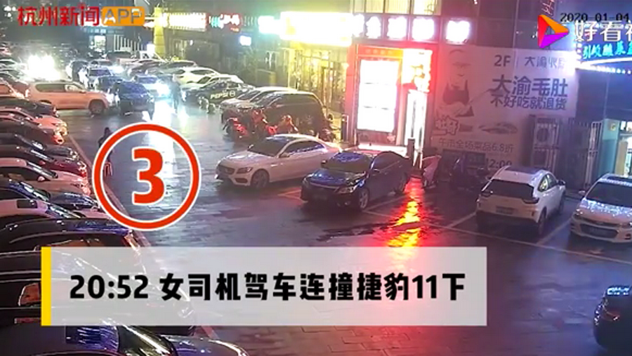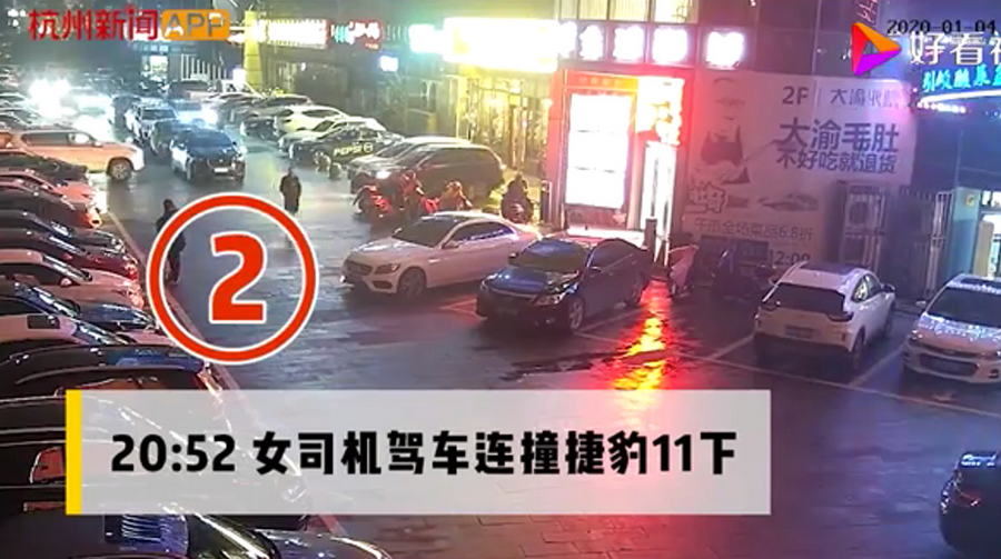 通過監(jiān)控發(fā)現(xiàn),捷豹車當(dāng)時并沒有停在停車位上,而是橫著停在停車位前的通道上,正好擋住了停在停車位里面的車輛。晚上8點40左右,一輛白色豐田普拉多越野車被捷豹擋住無法出去,10多分鐘后,司機(jī)通過倒車再加速十幾次撞擊捷豹,最終把車輛撞開后駛離現(xiàn)場。