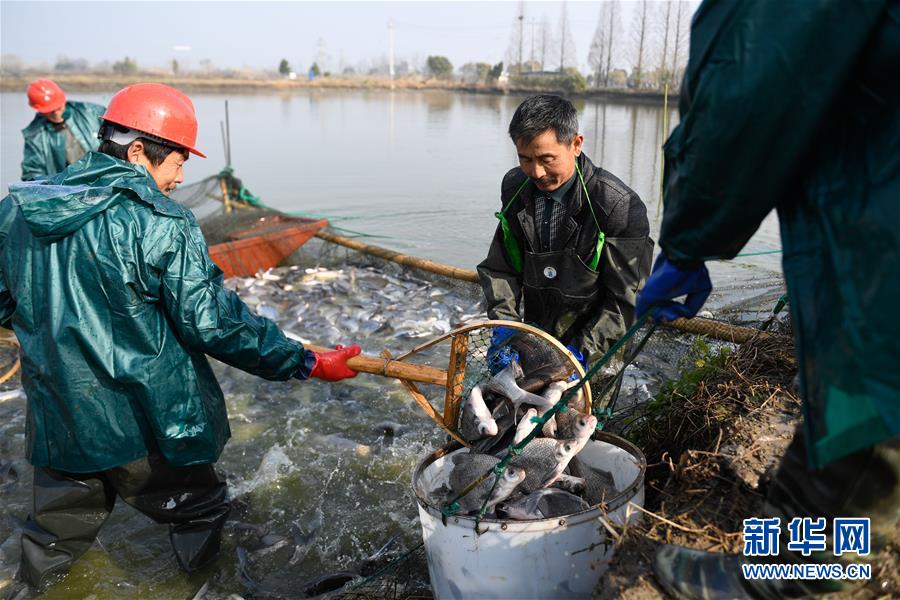 12月28日,漁民們?cè)诹夂?zhèn)盛江家庭農(nóng)場(chǎng)捕魚。新華社記者黃宗治攝