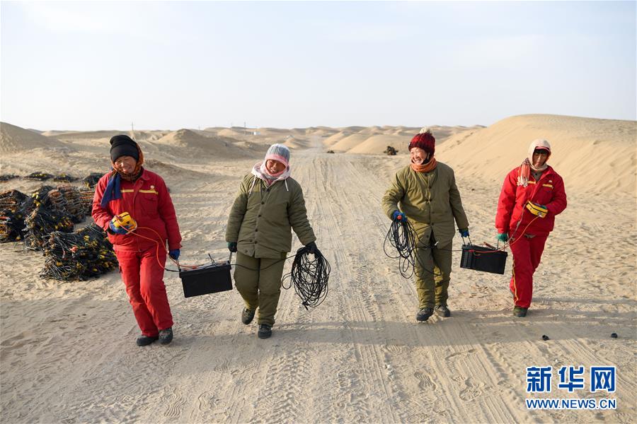 1月14日,4名測線女工抬著電瓶返回營地。地球物理勘探是油氣開發(fā)的第一步,相當于給地球做CT。物探工人按照嚴格的測線部署,在相應位置鉆井,然后實施地震,采集地震波數(shù)據(jù)。科研人員通過數(shù)據(jù)組成的“CT片”,就能夠清晰地“看”到地下的地質(zhì)結構,判斷哪里埋藏有石油或者天然氣。2019年10月,東方地球物理勘探有限責任公司塔里木物探處2113隊進入新疆塔克拉瑪干沙漠腹地,開始中古14-21、塔中2兩個區(qū)塊的三維地震勘探。近2000名物探工人將在1000平方公里的范圍內(nèi)一直工作到2020年4月,這也意味著他們將在塔克拉瑪干沙漠腹地連續(xù)度過第14個除夕夜。蘊藏著豐富石油天然氣資源的新疆塔克拉瑪干沙漠有“死亡之海”之稱,氣候干燥,年降水量在50毫米以下,冬季地表最低溫度超過零下30攝氏度,是世界油氣勘探難度最大的地區(qū)之一。為避開風季,物探工人每年9、10月份進入沙漠,一直工作到來年4月,夜以繼日與黃沙、嚴寒為伴,用辛勤的汗水,為祖國找油找氣。新華社記者丁磊攝
