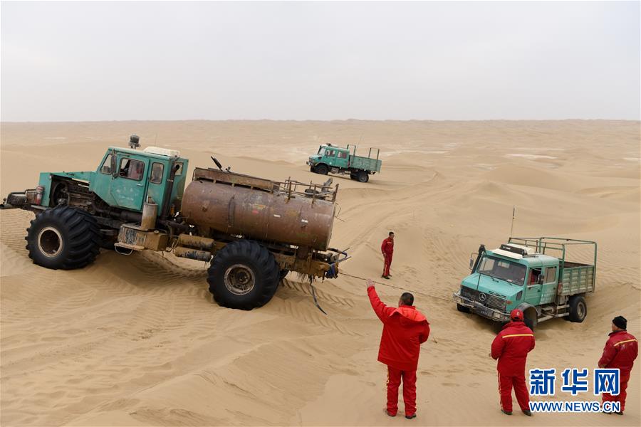 一輛測量作業(yè)車陷在沙坑中,水罐車進行營救(1月13日攝)。地球物理勘探是油氣開發(fā)的第一步,相當于給地球做CT。物探工人按照嚴格的測線部署,在相應位置鉆井,然后實施地震,采集地震波數(shù)據(jù)。科研人員通過數(shù)據(jù)組成的“CT片”,就能夠清晰地“看”到地下的地質(zhì)結構,判斷哪里埋藏有石油或者天然氣。2019年10月,東方地球物理勘探有限責任公司塔里木物探處2113隊進入新疆塔克拉瑪干沙漠腹地,開始中古14-21、塔中2兩個區(qū)塊的三維地震勘探。近2000名物探工人將在1000平方公里的范圍內(nèi)一直工作到2020年4月,這也意味著他們將在塔克拉瑪干沙漠腹地連續(xù)度過第14個除夕夜。蘊藏著豐富石油天然氣資源的新疆塔克拉瑪干沙漠有“死亡之?!敝Q,氣候干燥,年降水量在50毫米以下,冬季地表最低溫度超過零下30攝氏度,是世界油氣勘探難度最大的地區(qū)之一。為避開風季,物探工人每年9、10月份進入沙漠,一直工作到來年4月,夜以繼日與黃沙、嚴寒為伴,用辛勤的汗水,為祖國找油找氣。新華社記者丁磊攝