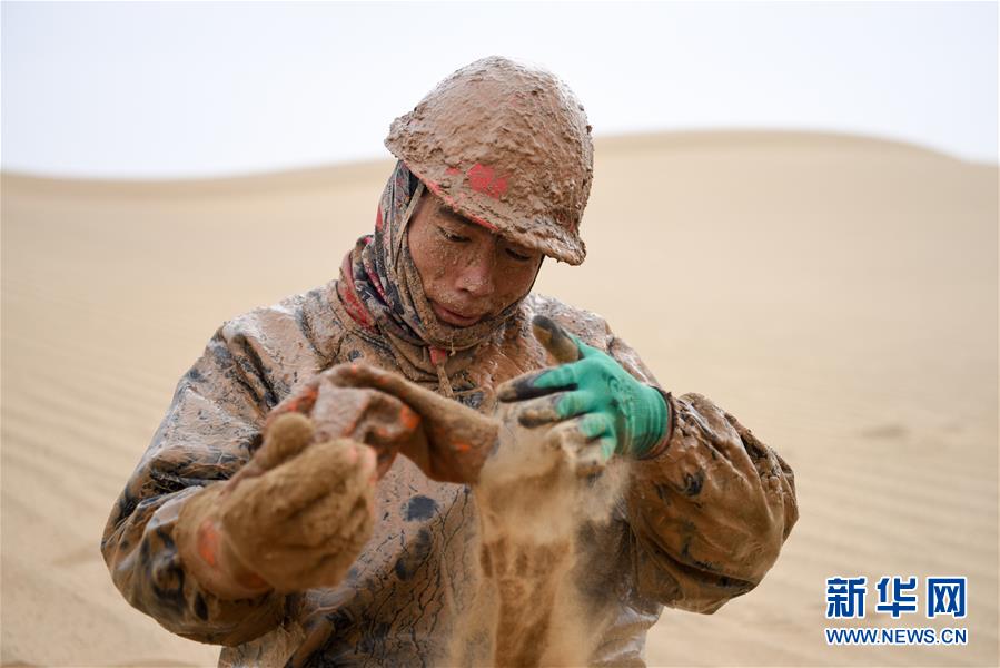 1月13日,鉆井工潘洪星用沙子帶出手套里的泥水。地球物理勘探是油氣開發(fā)的第一步,相當于給地球做CT。物探工人按照嚴格的測線部署,在相應位置鉆井,然后實施地震,采集地震波數(shù)據(jù)??蒲腥藛T通過數(shù)據(jù)組成的“CT片”,就能夠清晰地“看”到地下的地質(zhì)結構,判斷哪里埋藏有石油或者天然氣。2019年10月,東方地球物理勘探有限責任公司塔里木物探處2113隊進入新疆塔克拉瑪干沙漠腹地,開始中古14-21、塔中2兩個區(qū)塊的三維地震勘探。近2000名物探工人將在1000平方公里的范圍內(nèi)一直工作到2020年4月,這也意味著他們將在塔克拉瑪干沙漠腹地連續(xù)度過第14個除夕夜。蘊藏著豐富石油天然氣資源的新疆塔克拉瑪干沙漠有“死亡之海”之稱,氣候干燥,年降水量在50毫米以下,冬季地表最低溫度超過零下30攝氏度,是世界油氣勘探難度最大的地區(qū)之一。為避開風季,物探工人每年9、10月份進入沙漠,一直工作到來年4月,夜以繼日與黃沙、嚴寒為伴,用辛勤的汗水,為祖國找油找氣。新華社記者丁磊攝