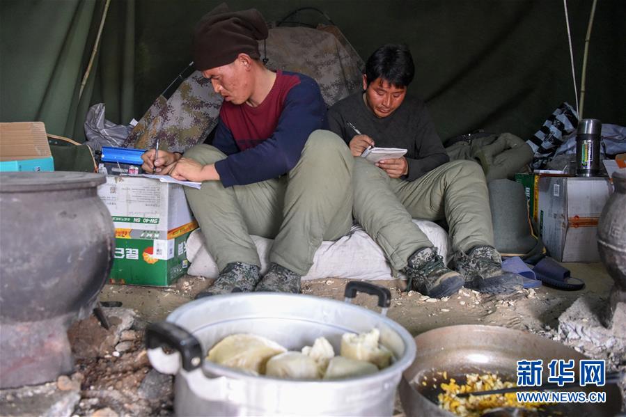 1月14日,查線工在吃飯間隙收聽電臺里報出的不正常道樁號,并記錄在本子上。地球物理勘探是油氣開發(fā)的第一步,相當于給地球做CT。物探工人按照嚴格的測線部署,在相應位置鉆井,然后實施地震,采集地震波數(shù)據(jù)。科研人員通過數(shù)據(jù)組成的“CT片”,就能夠清晰地“看”到地下的地質(zhì)結構,判斷哪里埋藏有石油或者天然氣。2019年10月,東方地球物理勘探有限責任公司塔里木物探處2113隊進入新疆塔克拉瑪干沙漠腹地,開始中古14-21、塔中2兩個區(qū)塊的三維地震勘探。近2000名物探工人將在1000平方公里的范圍內(nèi)一直工作到2020年4月,這也意味著他們將在塔克拉瑪干沙漠腹地連續(xù)度過第14個除夕夜。蘊藏著豐富石油天然氣資源的新疆塔克拉瑪干沙漠有“死亡之海”之稱,氣候干燥,年降水量在50毫米以下,冬季地表最低溫度超過零下30攝氏度,是世界油氣勘探難度最大的地區(qū)之一。為避開風季,物探工人每年9、10月份進入沙漠,一直工作到來年4月,夜以繼日與黃沙、嚴寒為伴,用辛勤的汗水,為祖國找油找氣。新華社記者丁磊攝