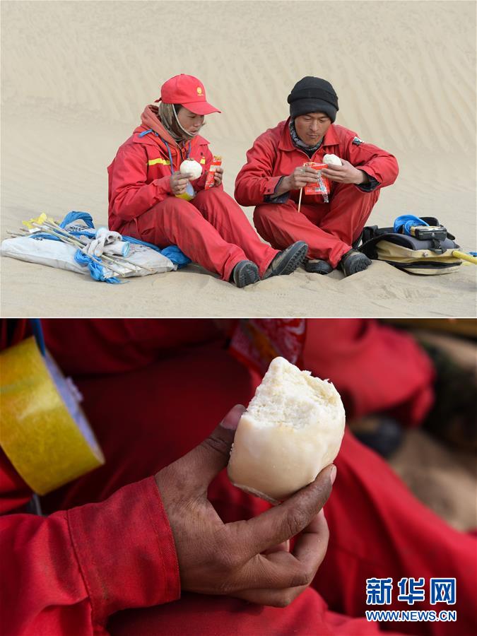 這是一張拼版圖片:上圖為測量工周國燕(左)和丈夫杞朝金在沙漠中解決午餐(1月13日攝);下圖為測量工周國燕在吃冰涼的饅頭(1月13日攝)。地球物理勘探是油氣開發(fā)的第一步,相當于給地球做CT。物探工人按照嚴格的測線部署,在相應位置鉆井,然后實施地震,采集地震波數(shù)據(jù)??蒲腥藛T通過數(shù)據(jù)組成的“CT片”,就能夠清晰地“看”到地下的地質(zhì)結構,判斷哪里埋藏有石油或者天然氣。2019年10月,東方地球物理勘探有限責任公司塔里木物探處2113隊進入新疆塔克拉瑪干沙漠腹地,開始中古14-21、塔中2兩個區(qū)塊的三維地震勘探。近2000名物探工人將在1000平方公里的范圍內(nèi)一直工作到2020年4月,這也意味著他們將在塔克拉瑪干沙漠腹地連續(xù)度過第14個除夕夜。蘊藏著豐富石油天然氣資源的新疆塔克拉瑪干沙漠有“死亡之?!敝Q,氣候干燥,年降水量在50毫米以下,冬季地表最低溫度超過零下30攝氏度,是世界油氣勘探難度最大的地區(qū)之一。為避開風季,物探工人每年9、10月份進入沙漠,一直工作到來年4月,夜以繼日與黃沙、嚴寒為伴,用辛勤的汗水,為祖國找油找氣。新華社記者丁磊攝