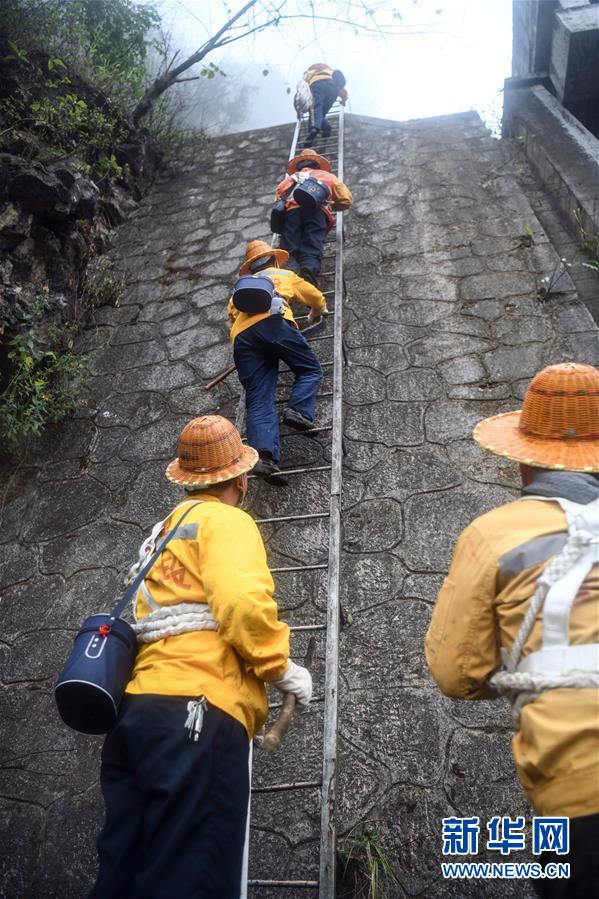 1月14日,百色工務(wù)段白水河橋隧工區(qū)班組成員攀梯上山開展巡查工作。在中國(guó)鐵路南寧局集團(tuán)公司百色工務(wù)段白水河橋隧工區(qū),有一個(gè)由14名工人組成的班組。他們常年像“爬山虎”一樣行走攀爬在地形險(xiǎn)峻、云霧繚繞的高山上,負(fù)責(zé)南昆鐵路轄區(qū)路段的搜山掃石工作,清除一切可能危害鐵路行車安全的因素,保障旅客出行安全。新華社記者張愛林?jǐn)z