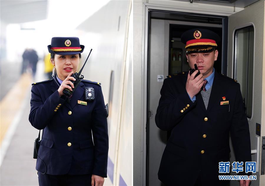 拼版照片左圖:在臨汾西站,列車長陳海燕通過對講機了解各個車廂的上車情況(新華社記者詹彥1月11日攝);右圖:在太原開往青島北的K884次列車上,列車長趙耀通過對講機了解各個車廂的情況(新華社記者楊晨光1月11日攝)。