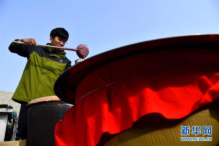 在榮成市煙墩角村,于海洋將蝦醬裝瓶(1月12日攝)。新華社記者 王凱 攝