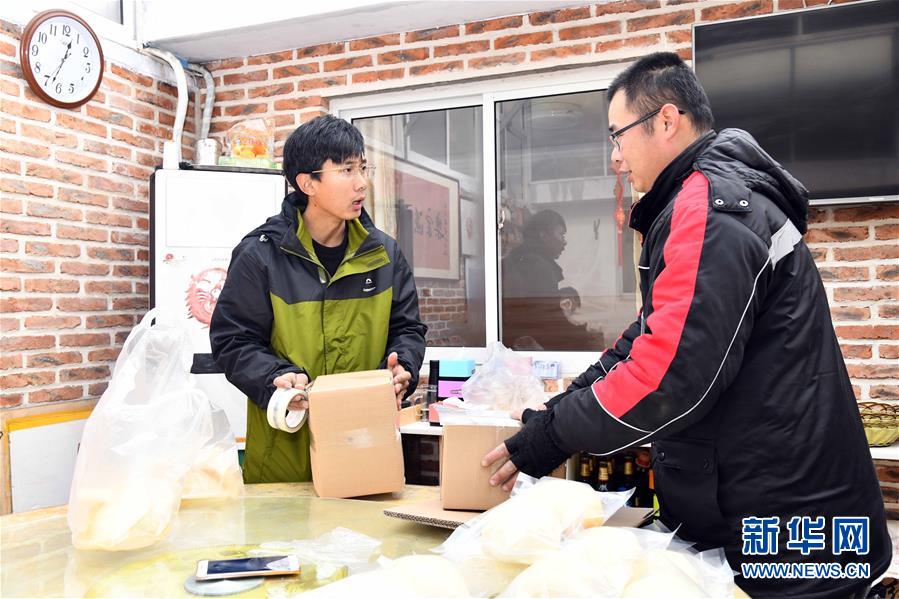 在榮成市煙墩角村,于海洋(左)與前來(lái)收貨的快遞小哥交談(1月12日攝)。新華社記者 王凱 攝