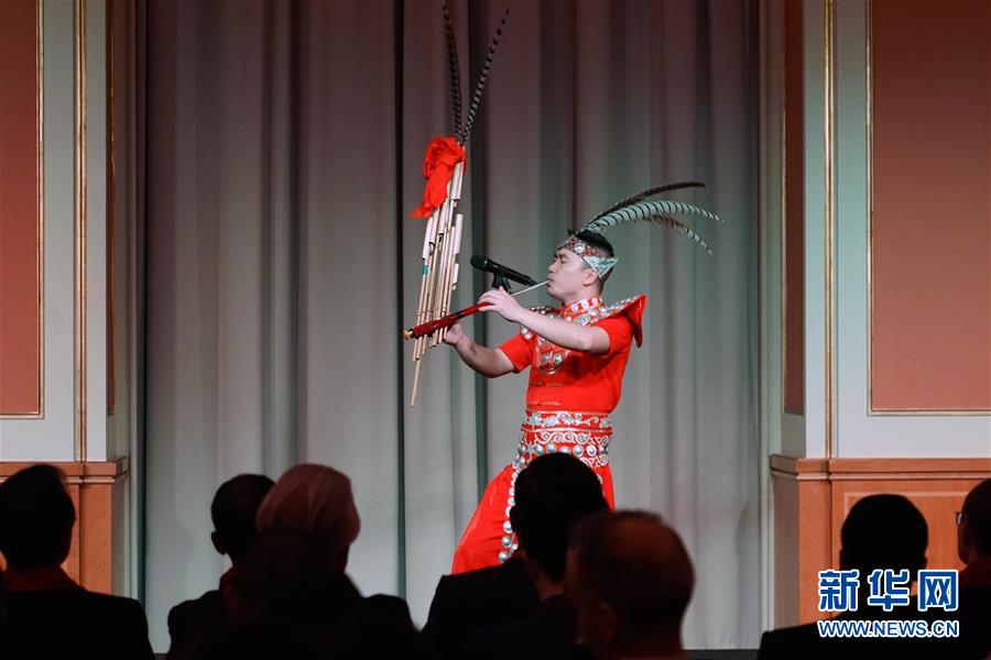 1月15日,在德國柏林,貴州省歌舞劇院藝術(shù)團(tuán)的演員在晚會上吹奏蘆笙。 15日晚,2020年“歡樂春節(jié)”新春文藝晚會在德國柏林的紅色市政廳上演,中德兩國各界代表觀看演出,共慶中國農(nóng)歷新年。 新華社記者 王勍 攝