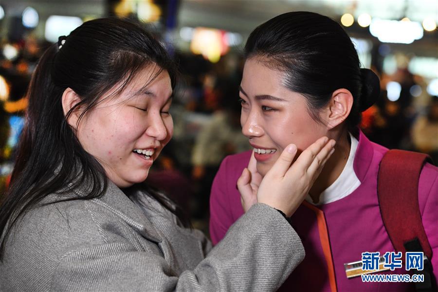 盲人姑娘吳瀟(左)從西安北站中轉(zhuǎn)回延安老家,得到吉如的溫馨服務(wù)。臨別時,吳瀟激動地說:“小姐姐,你的服務(wù)太貼心了,我看不見你,能摸摸你的臉頰嗎?”(1月15日攝)。 新華社記者 陶明 攝