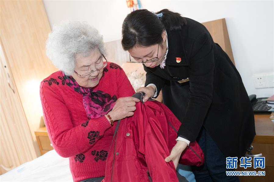 1月17日,張丹俠(右)幫助手臂曾經(jīng)骨折的王育華穿外衣。新華社記者 翁忻旸 攝