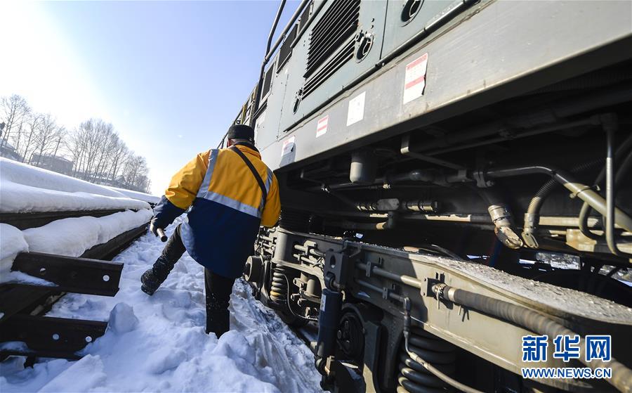 送水員黃衛(wèi)東在雪地中前行,準(zhǔn)備登上火車(chē)前往送水地點(diǎn)(1月17日攝)。新華社記者 許暢 攝