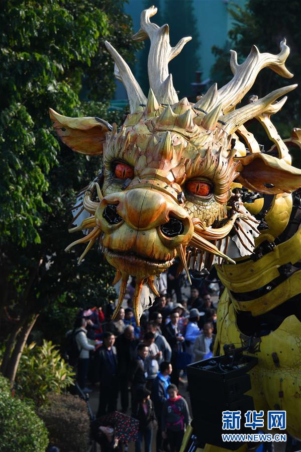 1月18日,大型機(jī)械裝置藝術(shù)品“龍馬精神”在珠海長隆海洋王國巡游展示。新華社記者 劉大偉 攝