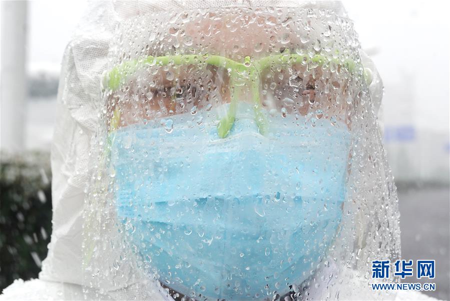 在武漢客廳方艙醫(yī)院,武漢市公安局東西湖區(qū)交通大隊(duì)快騎隊(duì)警務(wù)人員在現(xiàn)場執(zhí)勤。由于雨雪天氣,護(hù)目鏡上滿是霧水(2月15日攝)。 新華社記者 才揚(yáng) 攝