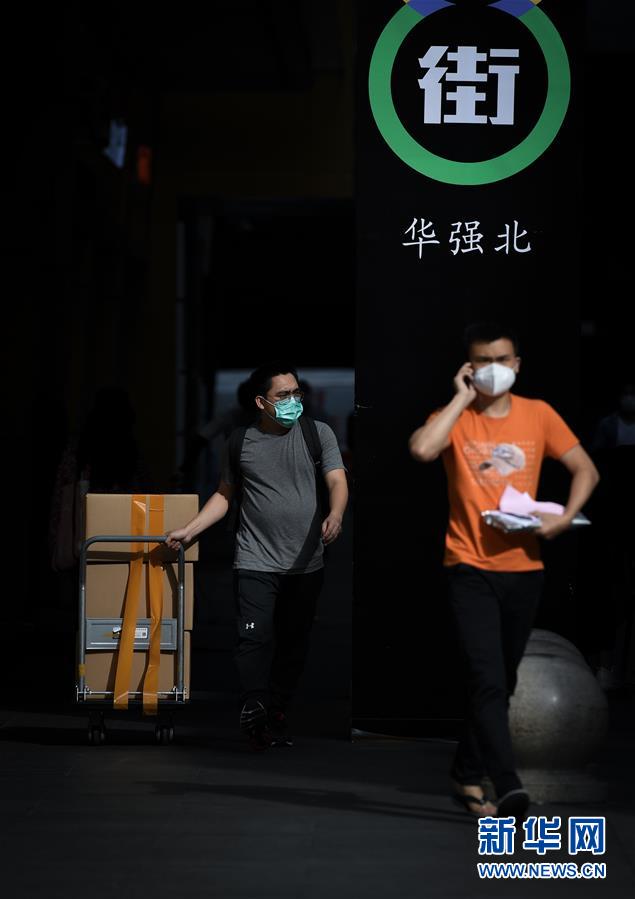 2月24日,在深圳華強(qiáng)北街頭,人們帶著口罩搬運(yùn)貨物。 新華社記者 毛思倩 攝