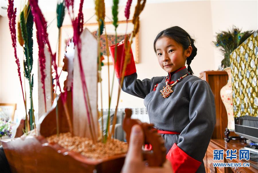 一名身著藏裝的藏族小姑娘在吃切瑪(2月24日攝)。當(dāng)日是藏歷新年初一,西藏各地群眾歡度藏歷新年。受新冠肺炎疫情影響,當(dāng)?shù)靥岢娫挵菽?、少出門、不聚集,居家享受新年樂趣。新華社記者晉美多吉攝