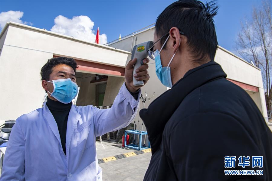 西藏大學(xué)醫(yī)學(xué)院預(yù)防專業(yè)本科生次成郎加(左)在學(xué)校門口為來校者測(cè)量體溫(2月23日攝)。新華社記者孫非攝