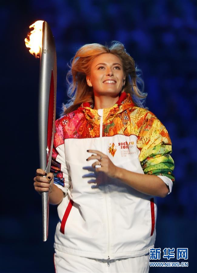 圖為2014年2月7日,莎拉波娃在索契冬奧會開幕式上手持火炬進(jìn)行傳遞。 新華社記者王麗莉攝