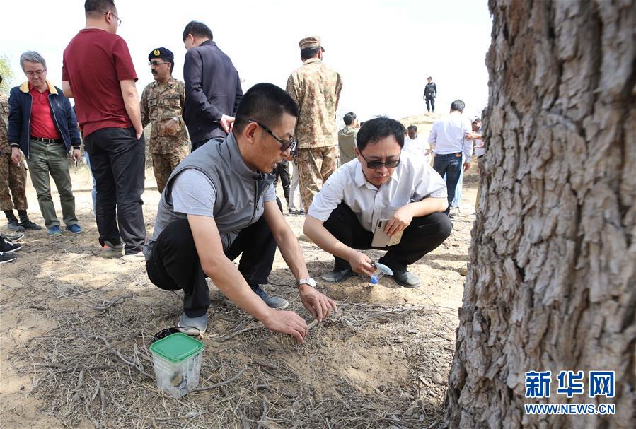 2月26日,在巴基斯坦信德省,中國蝗災防治工作組專家采集蝗蟲蟲卵。新華社記者劉天攝