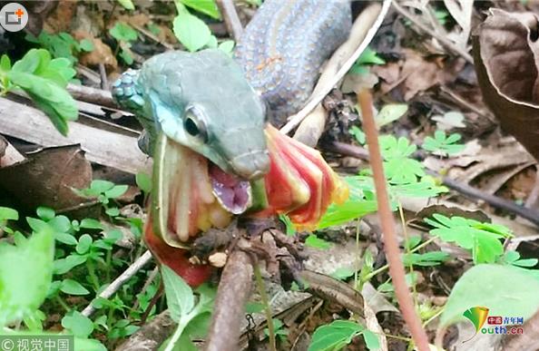 印度喀拉拉邦,一條大眼樹(shù)蛇非常貪婪地一口吞下了一只長(zhǎng)約10厘米的青蛙,只剩青蛙兩只腿在外掙扎。28歲的捕蛇人Sujith VP拍下這一過(guò)程。