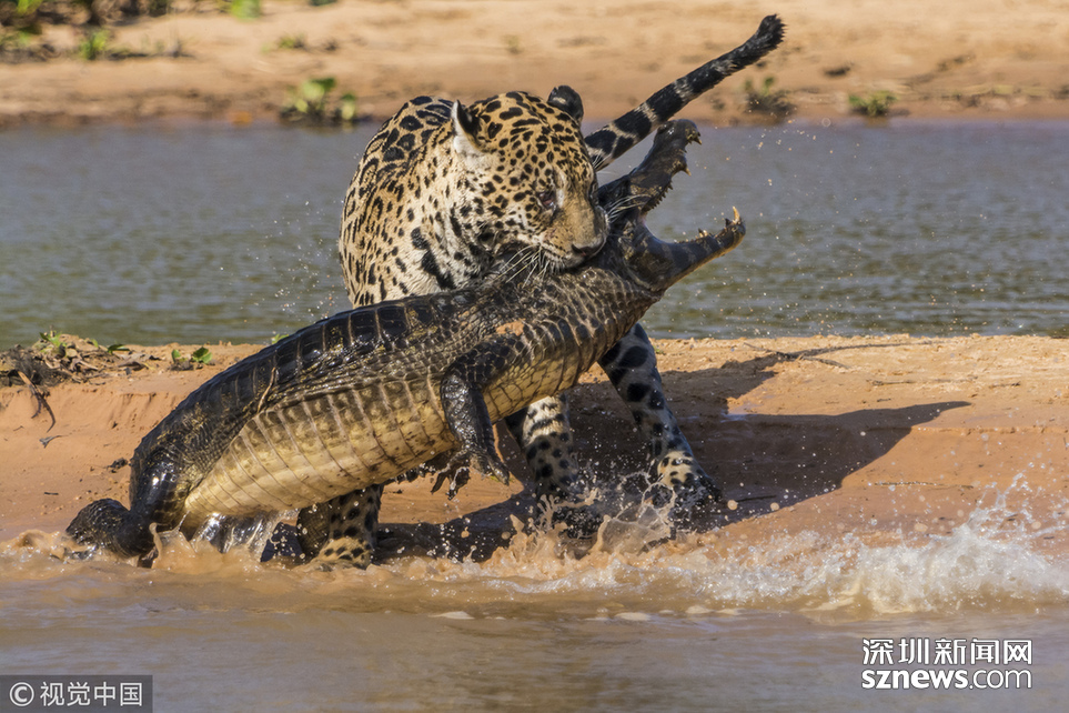 當地時間2013年8月25日,巴西潘特納爾,一頭雄性美洲豹攻擊了一條巴拉圭凱門鱷并與之纏斗。這只美洲豹預先躲在水中匍匐前進,然后突然出現把這只鱷魚震住,隨后用牙刺進鱷魚的堅硬的外殼中,將其拖入叢林……