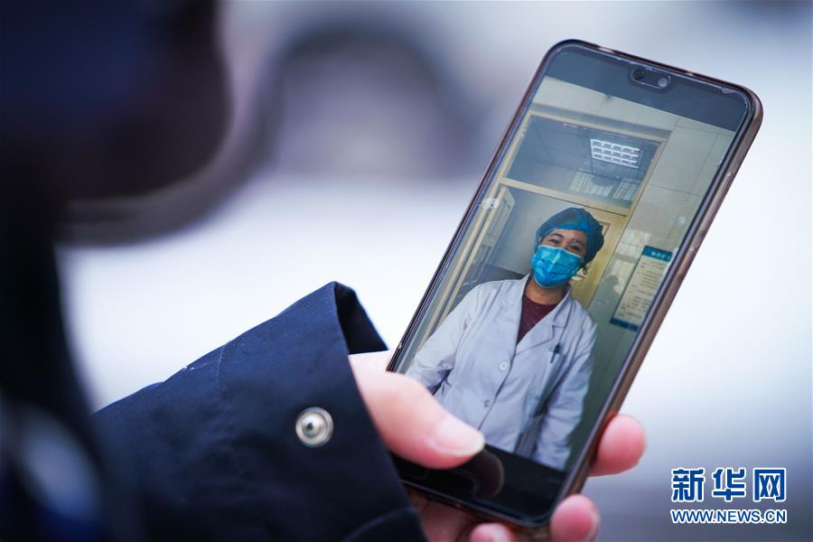 李可心展示手機里母親王晶的工作照(3月1日攝)。母親王晶是一名醫(yī)生,疫情期間在留觀病房工作。 新華社記者王松攝