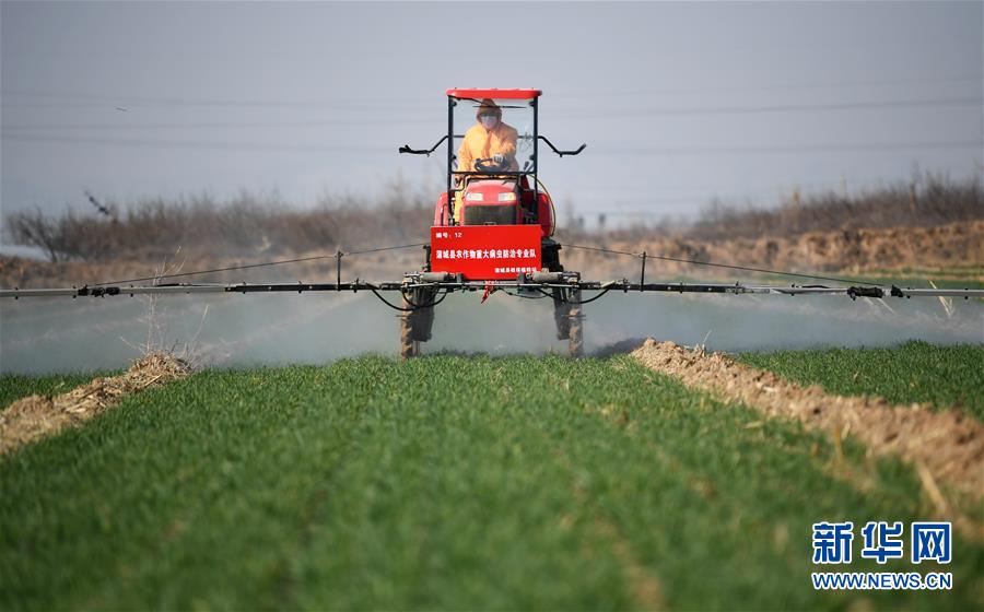 3月4日,建建農(nóng)機合作社社員在蒲城縣椿林鎮(zhèn)平峨村駕駛自走式高桿噴霧機為小麥噴灑除草殺菌劑。近日,為確保疫情期間不誤農(nóng)時,陜西省蒲城縣植保植檢站組織縣內7家農(nóng)作物病蟲害專業(yè)化防治單位,在小麥返青起身期,對麥田進行除草及病蟲害的防控工作。新華社記者李一博攝