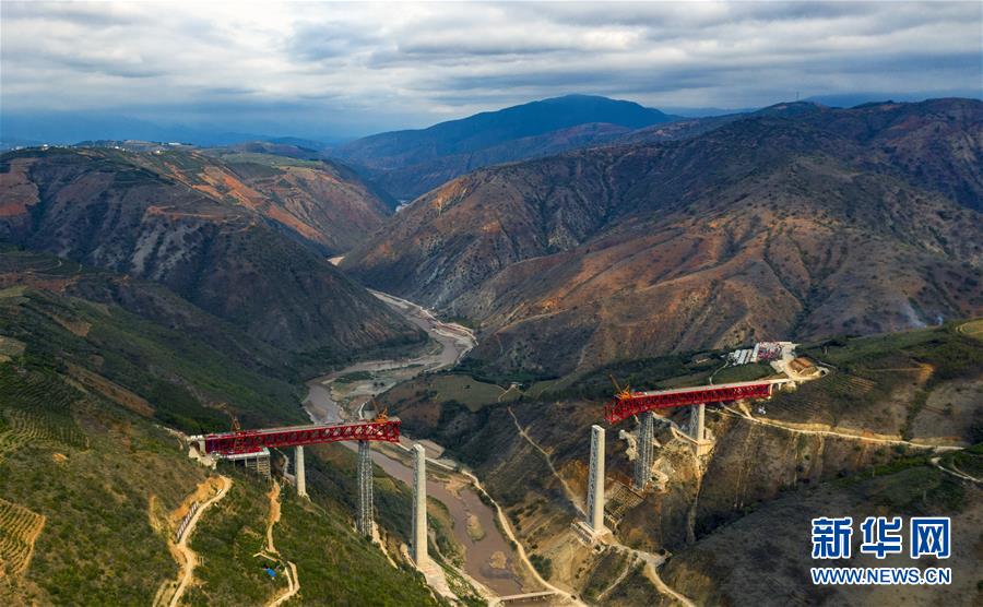 3月5日,空中俯瞰建設(shè)中的中老鐵路元江特大橋(無人機(jī)照片)。近期,中老鐵路玉溪至磨憨段有序復(fù)工復(fù)產(chǎn),由中鐵四局承建的中老鐵路全線重點控制性工程——元江特大橋、南溪河特大橋正在加緊施工建設(shè)。新華社記者 江文耀 攝