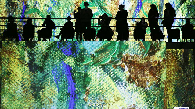 2月27日,在法國(guó)巴黎,人們?cè)凇稄哪巍⒗字Z阿到夏加爾:地中海之旅》光影藝術(shù)沉浸展的媒體預(yù)展上參觀。新華社記者高靜攝