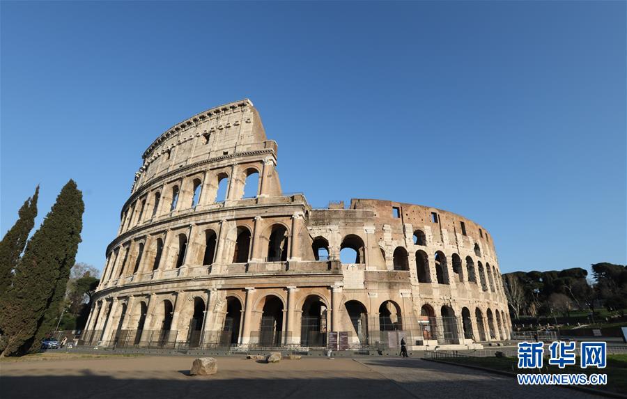 3月16日,在意大利首都羅馬,兩名警察在斗獸場(chǎng)外巡邏。新華社記者程婷婷攝