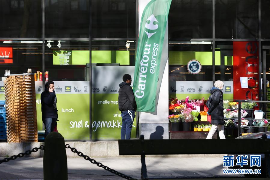3月18日,在比利時布魯塞爾,顧客排隊等待進入超市購物。  新華社記者 張鋮 攝