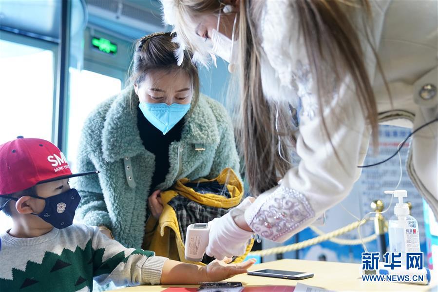 3月23日,在哈爾濱極地館入口,工作人員在給游客測(cè)量體溫。當(dāng)日,哈爾濱極地館恢復(fù)營(yíng)業(yè)。目前,極地館日接待人數(shù)不超過400人,園區(qū)采取分時(shí)段、間隔性辦法安排游客有序入園。游客實(shí)名預(yù)訂門票,入園要配合測(cè)溫、佩戴口罩、掃描“龍江健康碼”,刷身份證入館。新華社記者王建威攝