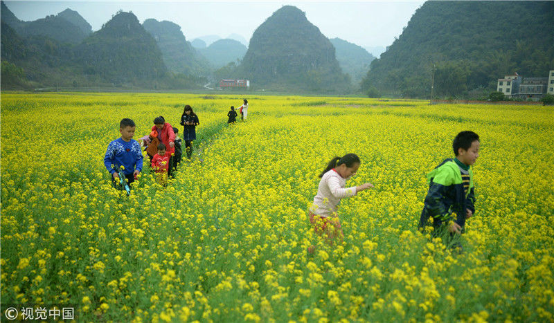 2019年2月5日,廣西來賓,當天是農(nóng)歷大年初一,人們在忻城縣城關鎮(zhèn)隆光村油菜花海中賞花游玩。