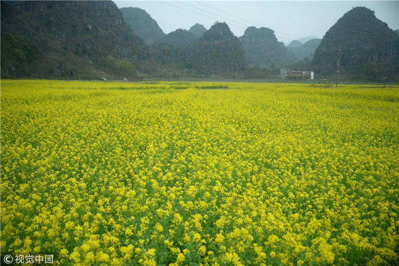 2019年2月5日,廣西來賓,當(dāng)天是農(nóng)歷大年初一,人們?cè)谛贸强h城關(guān)鎮(zhèn)隆光村油菜花海中賞花游玩。