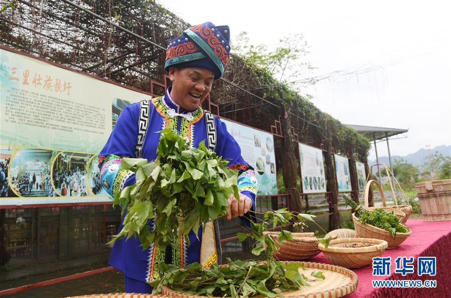 3月25日,在廣西上林縣巷賢鎮(zhèn),一名壯族女子在采摘給糯米染色所需要的植物。新華社記者陸波岸攝